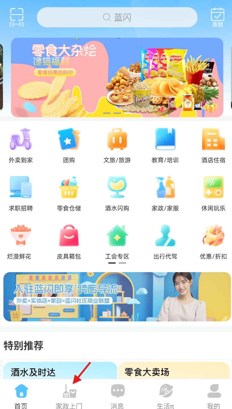 打开蓝闪软件后,在主界面底部的导航栏里找到“家政上门”选项并点击它。