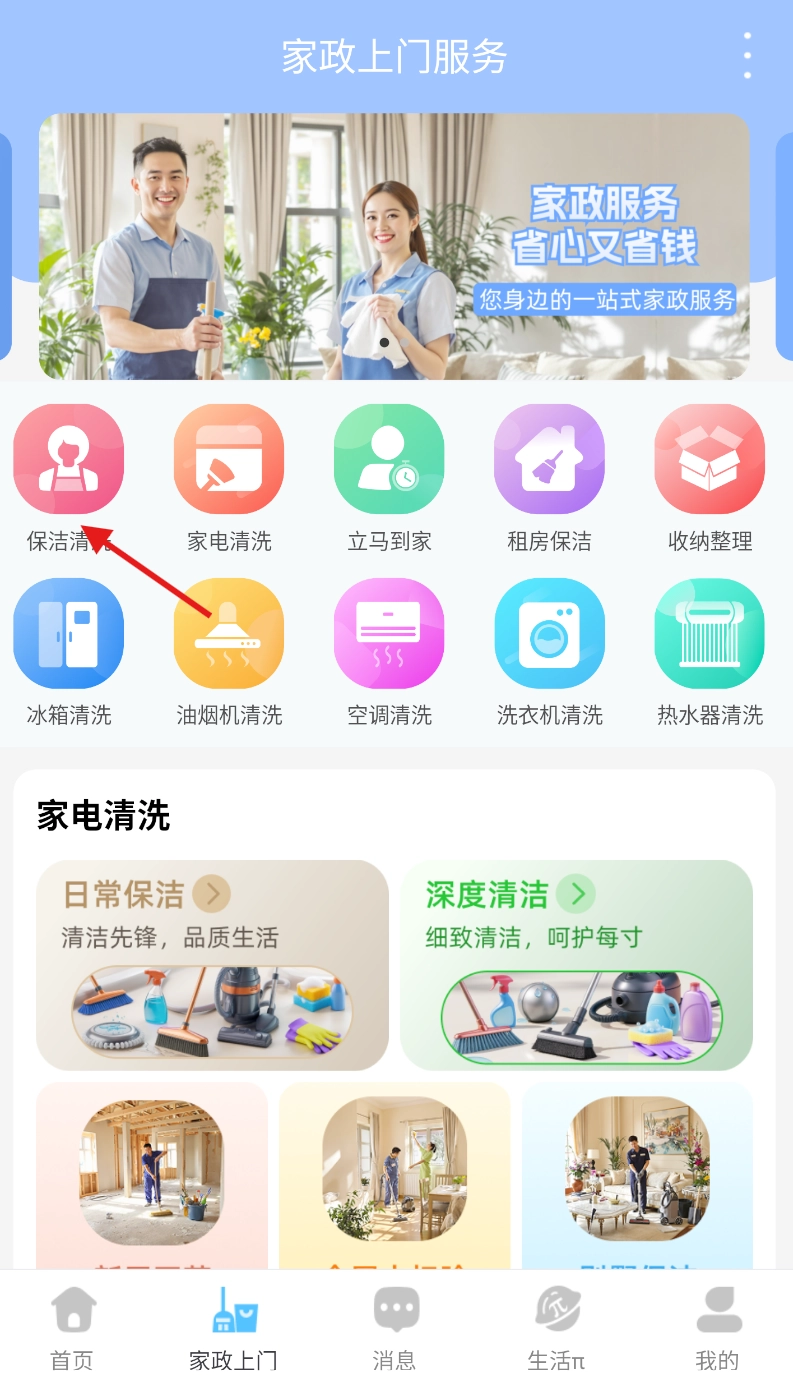 进入家政上门页面后,在琳琅满目的服务类别里,点击并选择“保洁清洗”板块。