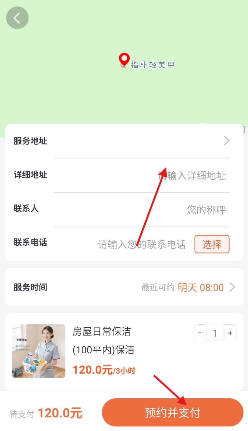 在预约页面精准填写服务地址等相关信息,认真核对确认无误后,点击预约按钮并完成支付流程。