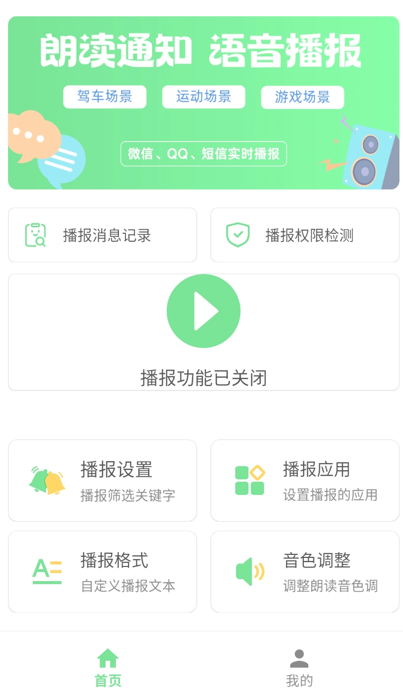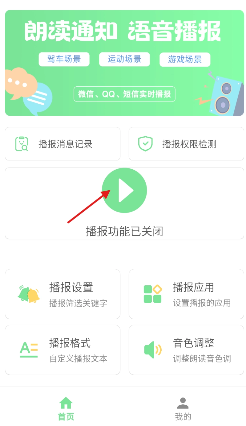 要开启通知语音播报功能,你可以在软件的首页界面里找到那个播放符号的图标,然后点击它。