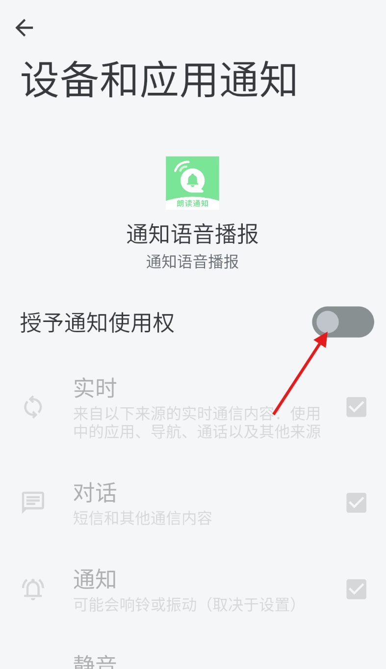 跳转至通知语音播报的手机系统设置界面后,找到并点击“授予通知使用权”选项,随后启用该功能。