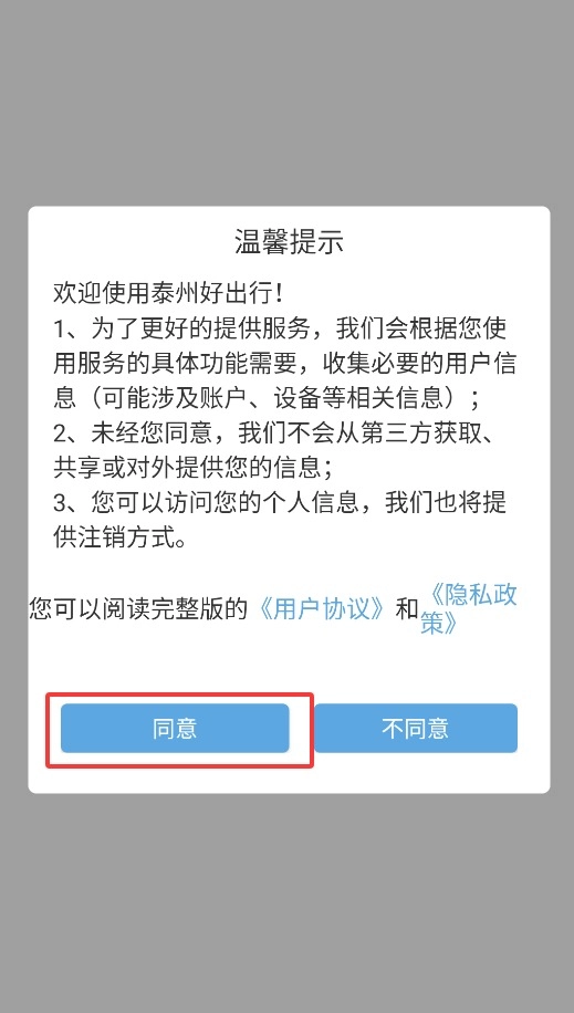 首次启动应用时,需要点击同意用户协议的弹窗,这样才能进入主界面开始使用。
