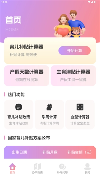 直接进入首页,就能使用首页提供的育儿补贴计算器、产假计算、生育津贴计算等功能。