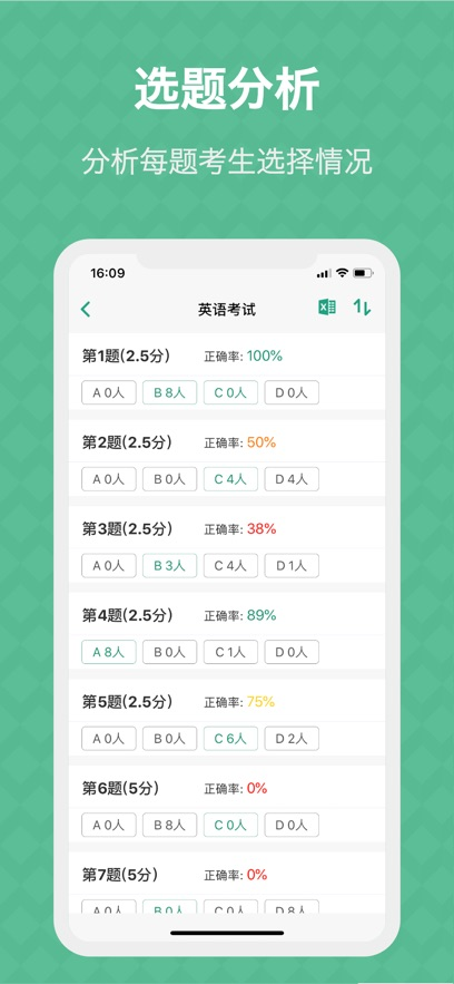 除了总体分数外,还可以查看每个考生的具体答案情况以及每道题目的正确率。