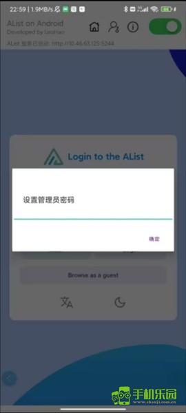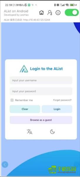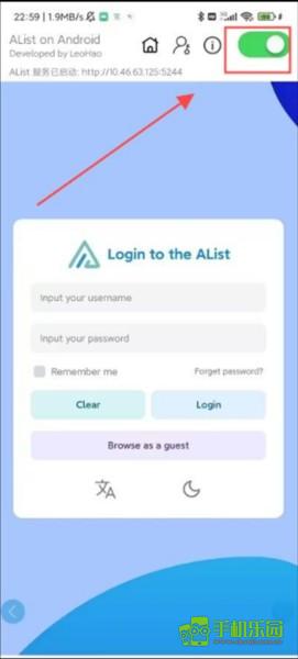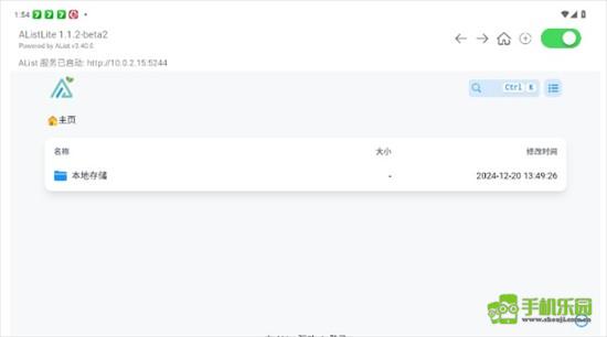 2、启动alistlite服务后,建议在电脑上访问对应的服务地址,以便对AList进行后续配置。在alistlite界面中,点击右上角的开关按钮,就能开启或关闭AList服务。当服务成功启动后,会呈现AList的前端页面,同时显示当前已绑定的IP地址与端口信息。