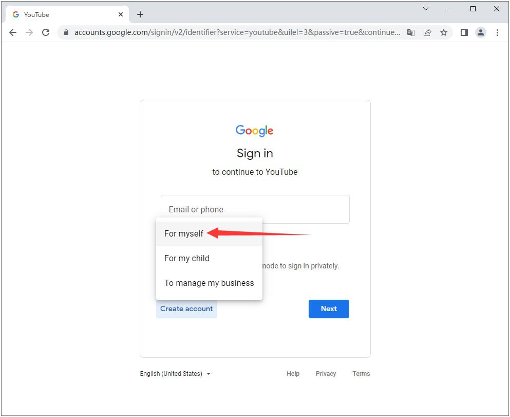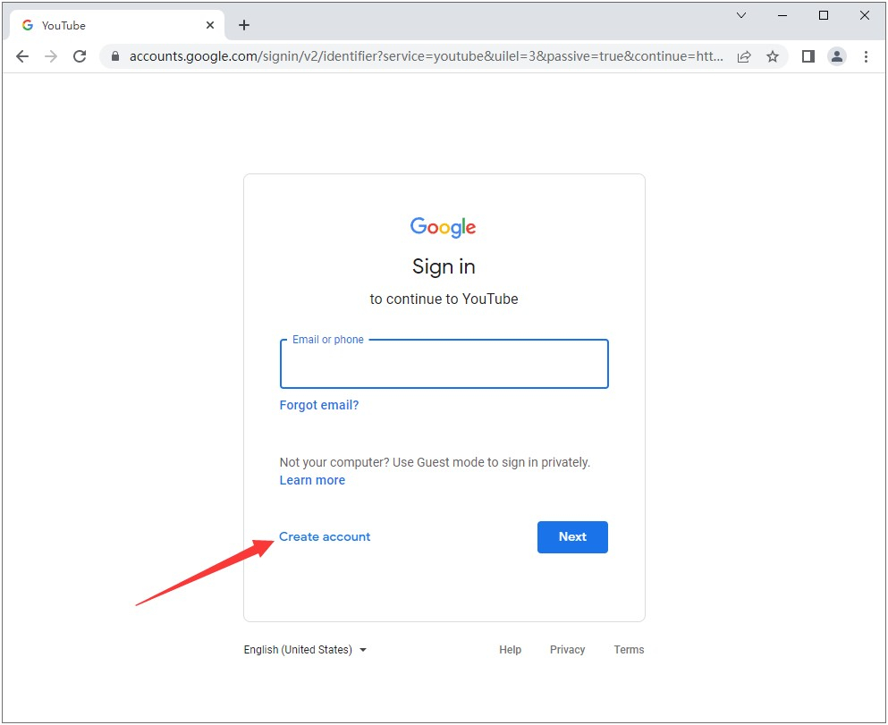 2、接着会跳转到谷歌的注册页面(由于谷歌和YouTube同属一家公司),我们点击底部的“Create account”按钮。