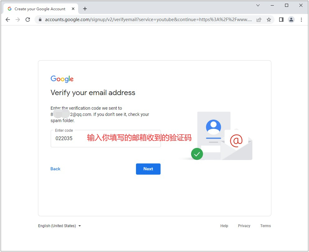 5、在该页面,您需要输入您填写的邮箱收到的验证码,然后点击“Next”按钮。
