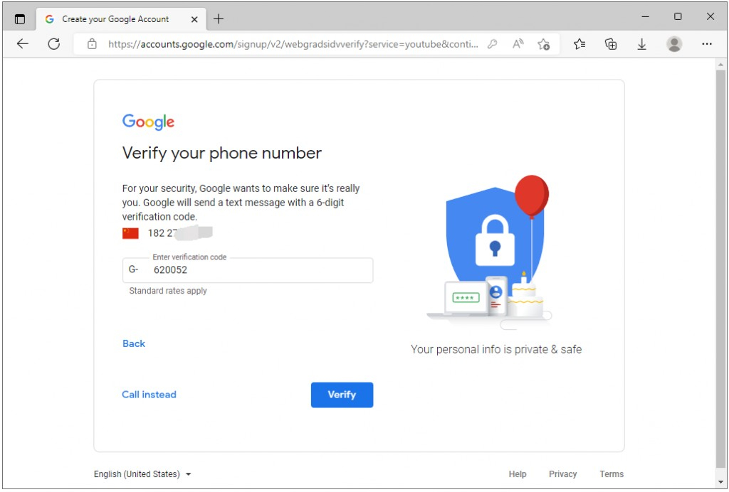 8、请输入您收到的手机验证码。很多人在这一步会遇到问题,主要是因为浏览器未设置为英文,从而导致无法接收到验证码,并被谷歌提示“此电话号码不能用于验证”。