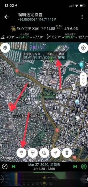 5、屏幕左下角的时间按钮,按一下就会变成现在时间。拖动滑块就可以看到月亮的移动轨迹,下面这张,是如果使用1200mm(600mm加2倍增距镜),在12公里以外的效果。