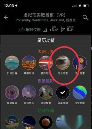 2、焦距上面一点点,有一条彩色方块可以调出你要拍摄的内容,这里选择“日月位置”。