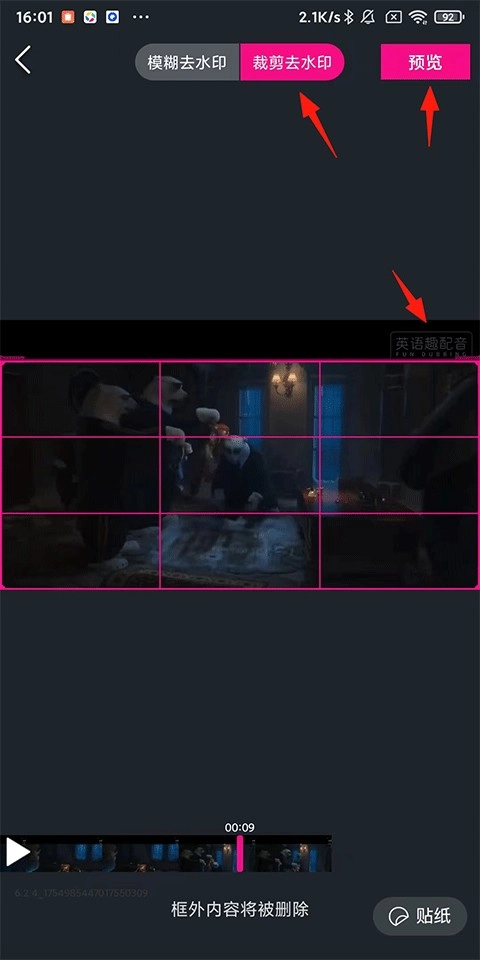 使用【裁剪去水印】功能时,框选画面中无水印的区域,框选范围外的内容会被移除,操作完成后点击【预览】确认效果,再进行导出即可。(提示:该功能需开通会员后使用)
