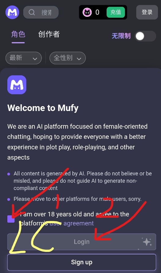 1、打开mufy,点击下图中箭头所指的方框区域,接着点击Login按钮。