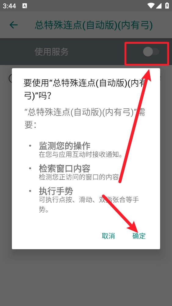 2、系统跳转至无障碍服务页面,打开“使用服务”开关并确认授权。