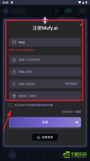 3、没有账号可以注册,输入邮箱和密码,点击同意事项。