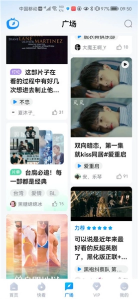 广场页面查看用户推荐影片,参与讨论互动。