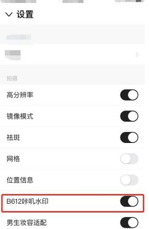 4. 在设置页面,找到"B612咔叽水印"选项,开启右侧开关