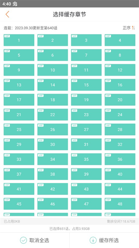 2、选择你想要缓存的章节,点击右下角缓存即可。