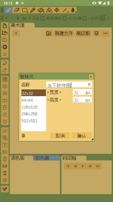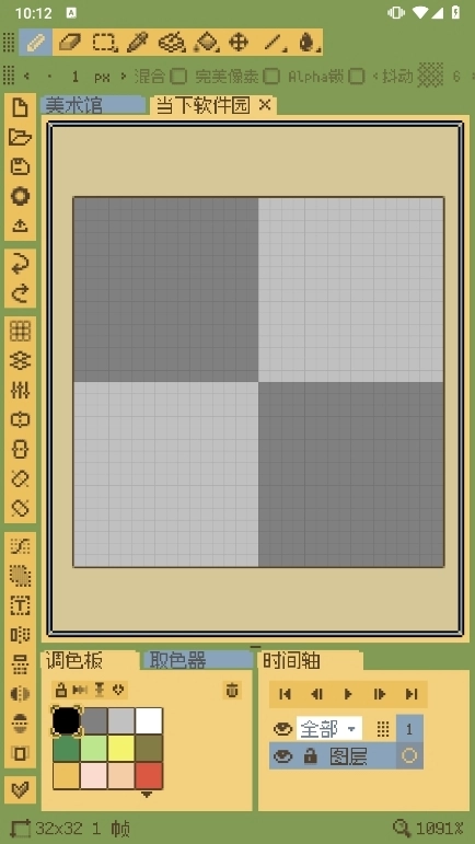 3、全方位工具组合:提供画笔、选择工具、拾色器、油漆桶和形状工具等,支持像素完美、抖动模式及Alpha锁定,工具栏随时访问。