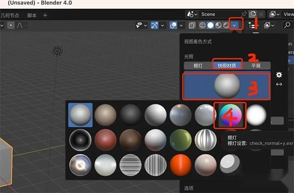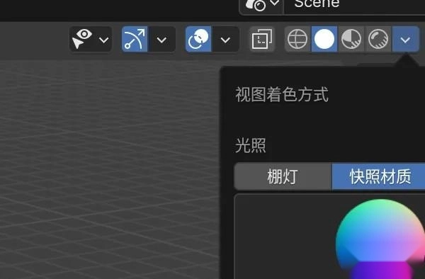 在右上角小三角的下拉菜单里,把【光照】切换为【快照材质】,再挑选蓝紫色的材质球。