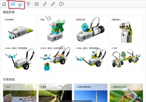 3、点击窗口左上角的书本图标,即可进入【基础实验】【引导实验】【开放性实验】等模块开展学习。