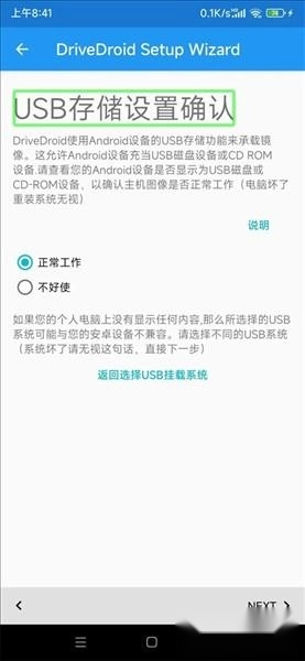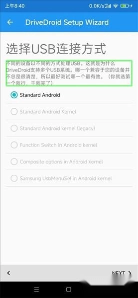 下面需要选择USB连接方式,选择“Sta nd ard Android”选项,随后点击NEXT继续。