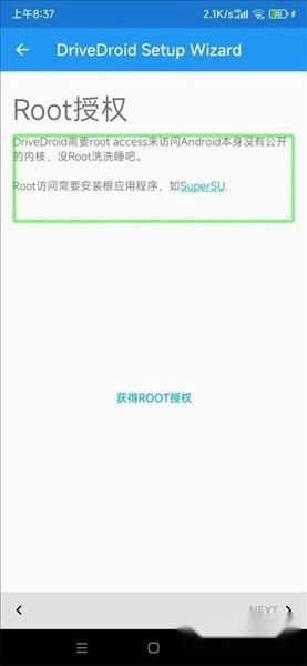 此时会进入获取root授权的页面,点击“获得root授权”按钮;由于每个人的root方式存在差异,请选择适合自身的方式来授予root权限。成功取得root授权后,继续点击next按钮即可。