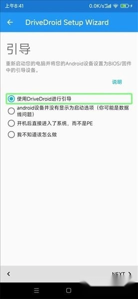 下面开始选择引导方式,选择“使用DriveDroid进行引导”,点击两次next按钮以完成配置向导。