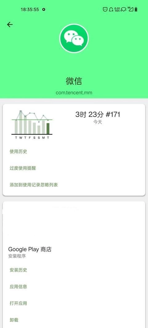 点开一个想要查看的软件,就能能查看近一周使用时长统计,更牛掰的是,它甚至能查看应用版本号以及初次安装时间