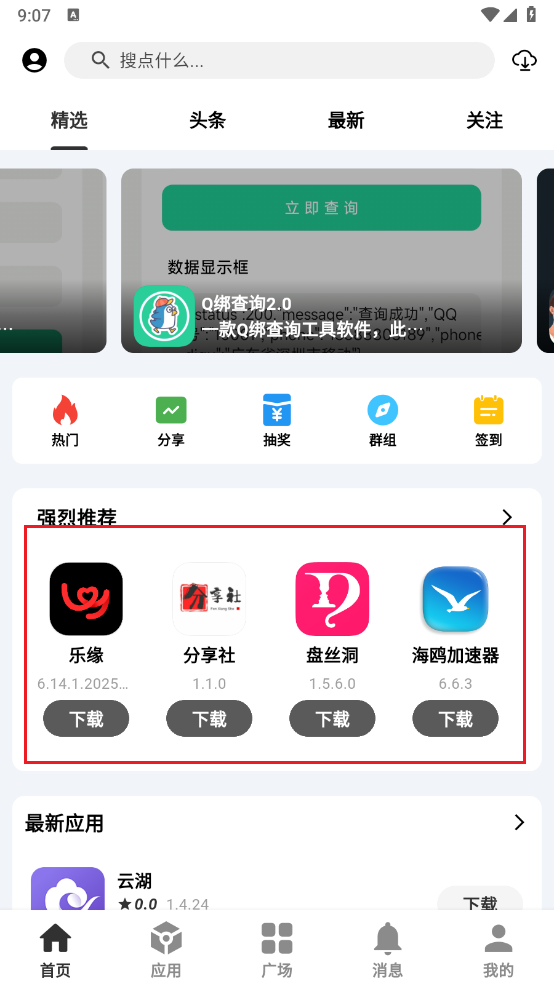 1、打开分享社区,进入首页并向左滑动选择“强烈推荐”的应用。