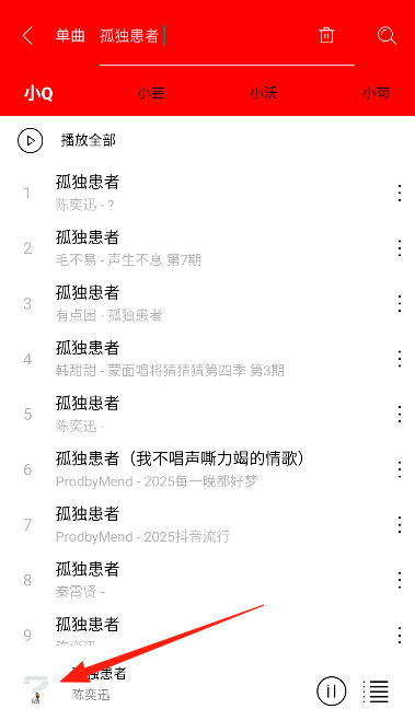 4、在搜索结果里找到你想播放的歌曲,点击该歌曲即可开始播放。