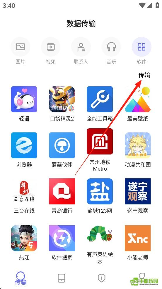 2、以软件传输为例,点击【软件】,然后点击【传输】