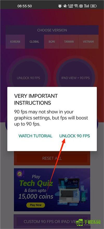 1、启动软件后,选择全局模式(global),接着点击解锁90帧模式的按钮