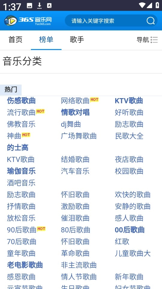 365音乐网是一款十分实用的音乐播放软件,它为用户提供海量免费音乐,涵盖网络、伤感、经典、英文、韩国、KTV、DJ、非主流、粤语等多种音乐类型。 365音乐网手机版还会呈现各类音乐榜单,像KTV热门歌曲、新歌top100等,支持用户通过歌曲关键词或歌手名称检索音乐,而且听歌时不会过度消耗手机电量,快来体验吧!