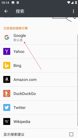 进入搜索设置页面后,勾选【Google】选项,即可将其设为浏览器的默认搜索引擎。