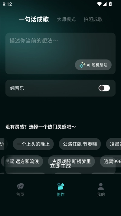 若想快速创作,可选择「一句话成歌」功能,直接输入灵感文字即可;解除字数限制后,还能更自由地描述你的想法。