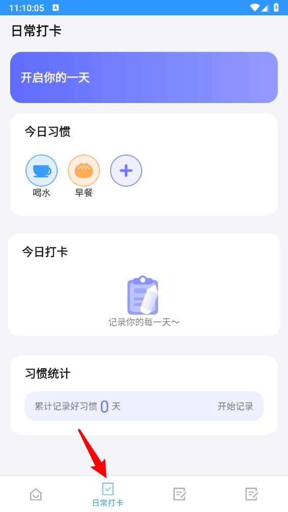 在“日常打卡”页面能够对喝水、早餐、跑步等项目进行打卡操作。
