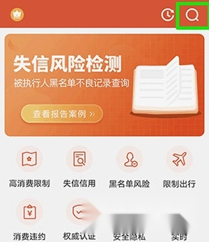 打开全国法院失信人查询手机版,在软件的个人查询页面找到并点击绿色方框内的按钮。