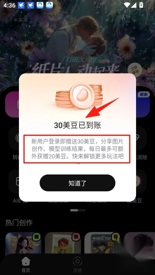 1.新用户登录会送80美豆,每日分享作品还能获得额外20美豆奖励。
