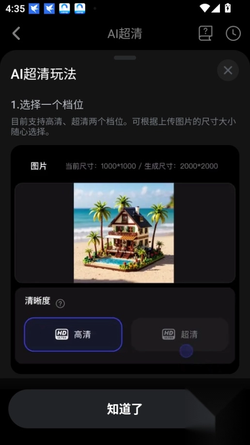 2.选择「AI超清」选项,即可进入画质修复操作页面