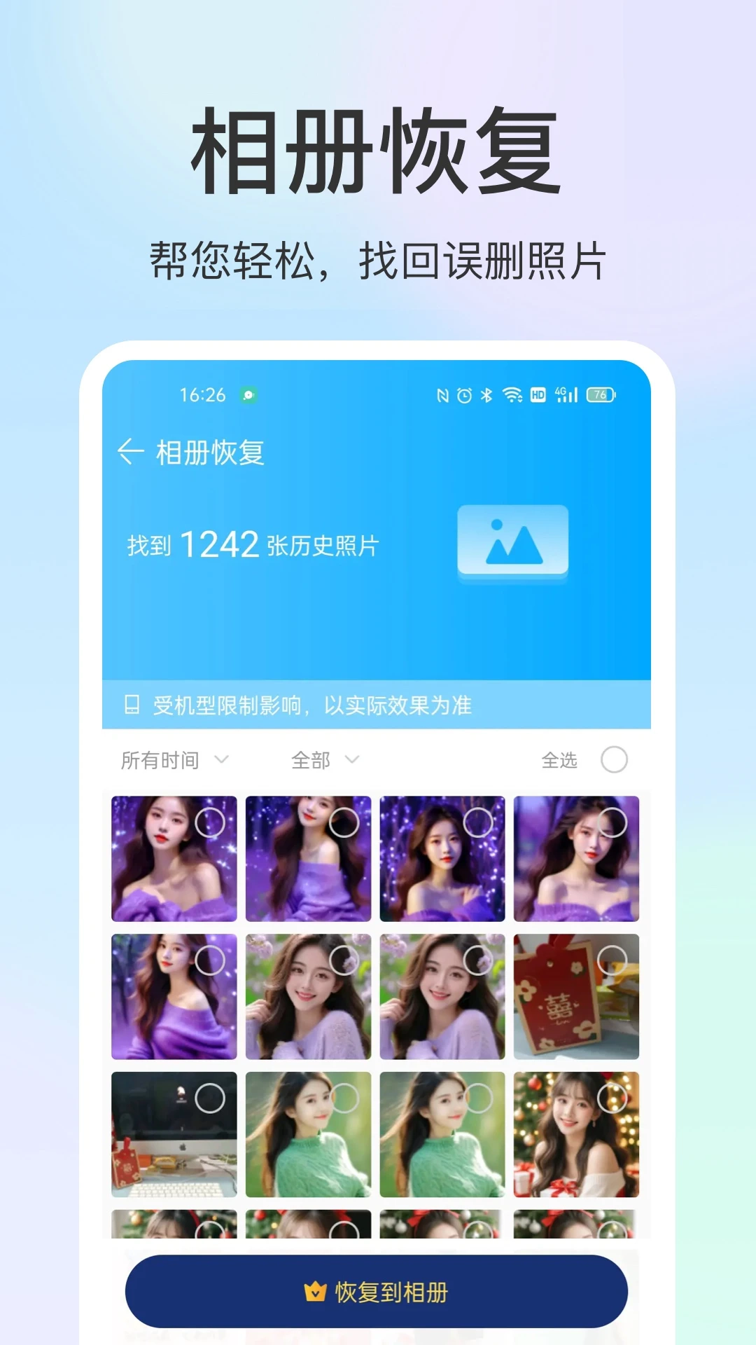 【相册恢复】运用先进的数据恢复技术,可从手机里找回不慎删除的照片。操作简单,仅需几步就能找回珍贵回忆,是数据保护的得力助手。