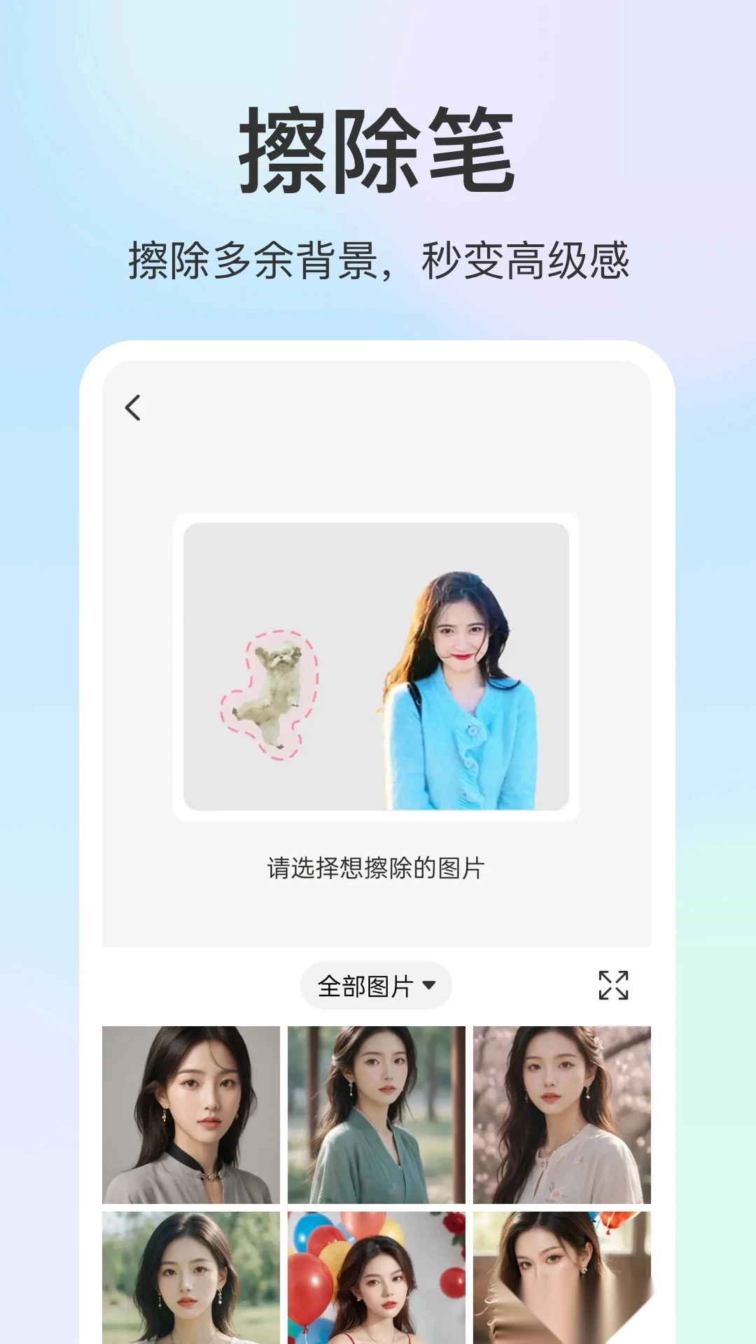 【擦除笔】可以用擦除笔轻松去除照片中不需要的元素,如背景杂物、多余的文字或标志等。能自然融合擦除区域,保持图片的整体美观。擦除笔功能让图片编辑变得简单,帮助快速打造完美照片。