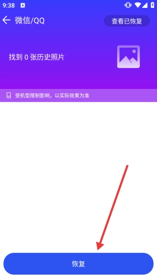 3、进入“微信/QQ”恢复页面,如果有可以恢复图片,点击底部【恢复】操作即可。