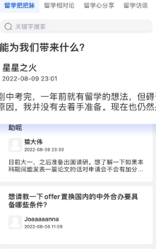这是一个专为留学生打造的自由交流平台,在这里你可以分享自己的留学经历,也能提出并解决留学过程中遇到的各种疑问,还能随时和其他留学生就留学前、留学期间以及留学后的学习、工作、生活等方面进行交流。