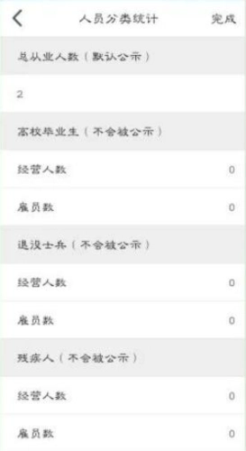 进入“人员分类统计”页面后,依据要求依次填写各项内容,完成后点击页面右上角的“完成”按钮。回到上一个填写页面时,再次点击该页面右上角的“完成”按钮,即可结束基本信息的填写。特别提醒:所有涉及人数的项目,即便实际人数为零,也需填写“0”,否则将无法顺利提交。