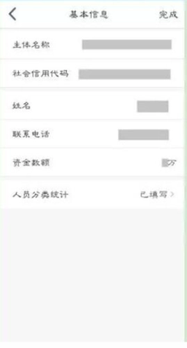 进入基本信息填写页面后,请按要求填写相关信息:主体名称需填写营业执照上的全称;社会信用代码填写营业执照上的统一社会信用代码或注册号;姓名填写营业执照上的负责人或法人姓名;联系电话填写负责人或法人的手机号码;资金数额填写注册营业执照时的注册资金或开办资金。填写完成后点击“人员分类统计”。