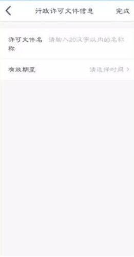 进入行政许可文件信息填写页面后,先填写行政许可文件名称,再填写许可文件有效期。填好后点击右上角的“完成”按钮。要是有多个许可文件,就重复上述操作,把所有许可文件都添加好。之后返回上一页面,点击该页面右上角的“完成”按钮,这样就完成行政许可情况的填报了。