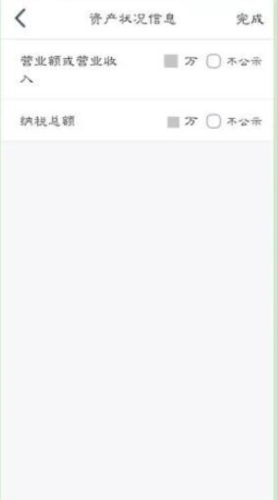 进入资产状况信息填报页面后,依次填写当年全年的营业收入和全年纳税总额,随后点击右上角的“完成”按钮,即可完成资产状况信息的填报。