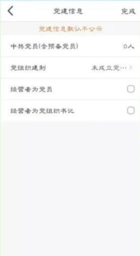 中共党员(含预备党员)→依据实际情况填写店内党员数量,若没有则填“0”。党组织建制→根据实际情况进行点选,若没有则选择未成立党组织。经营者为党员→若经营者(负责人)是党员,就进行勾选,若不是则不勾选。经营者为党组织书记→若经营者(负责人)是党组织书记,就进行勾选,若不是则不勾选。所有内容填写完成后,点击页面右上角的“完成”按钮。