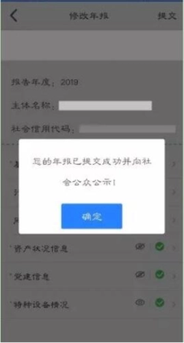 点击“确定”按钮后,系统会提示年报提交成功并向社会公众公示,之后再次点击“确定”按钮即可。