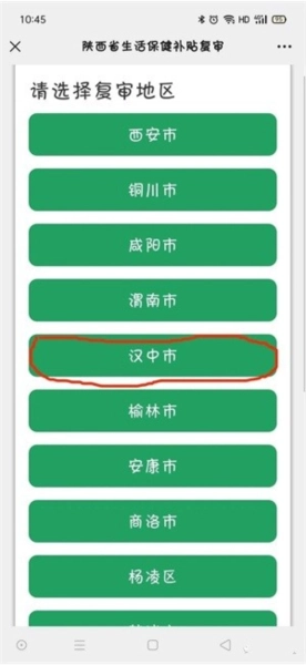 进入软件界面或关注并进入公众号后,点击左下角的“服务”选项,进入“补贴复审”页面,接着选择复审地区为“汉中市----汉台区”,具体操作可参考下图: